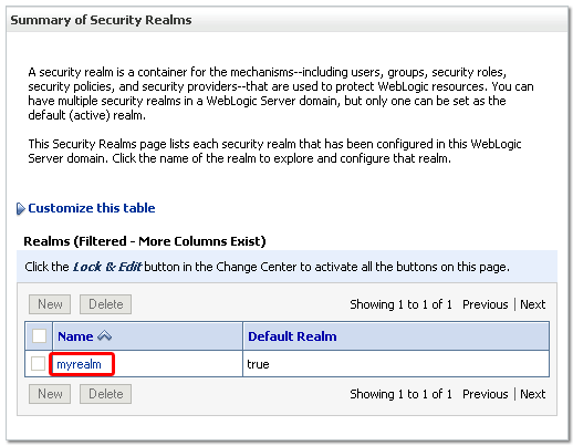 | 5 . | The "Summary of Security Realms" pane appears on the right. Select myrealm from the Realms table.![]() |