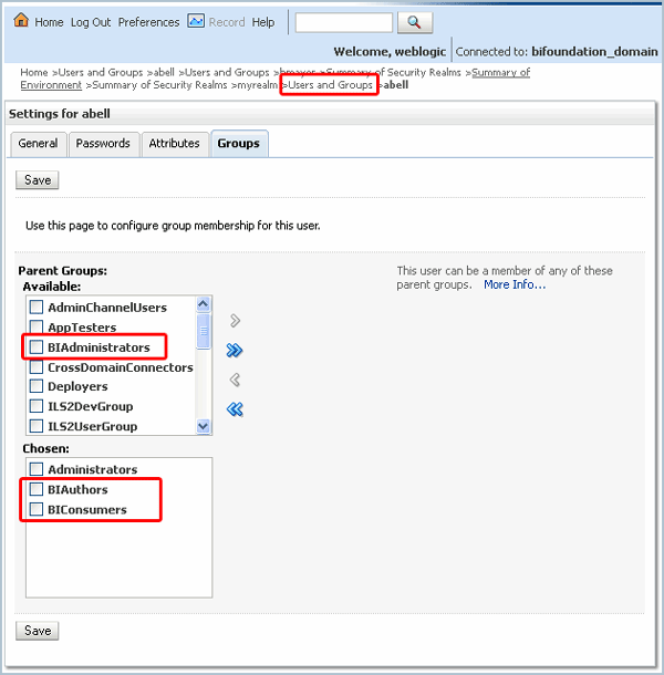 and then use the arrow buttons ( There are three default groups specific to Oracle BI: BIAdministrators (in the Available grouping in the image), BIAuthors, and BIConsumers (both in the Chosen grouping in the image). These default groups are provided as a convenience during installation, so that you can use the Oracle BI software immediately. Groups are nested in a hierarchy.
