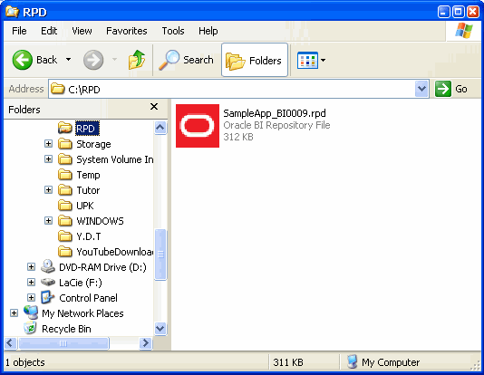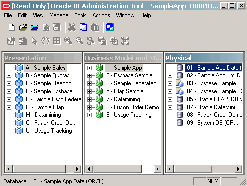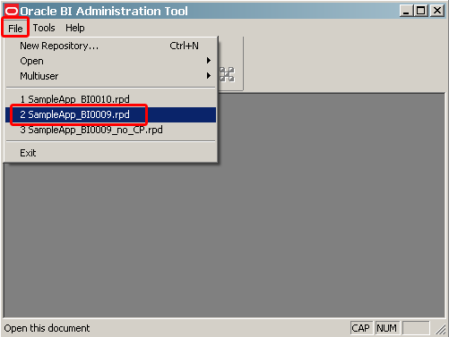 | 3 . | The repositories are located in In the Open dialog box, select the SampleApp repository (for example, SampleApp_BI0010.rpd) and click Open. ![]() Note that Oracle BI Release 11g (11.1.1.5) automatically appends a numeric, incremental suffix to each version of the .rpd file. |
