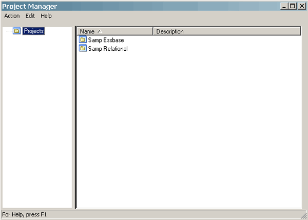 | 3 . | Click Manage > Projects to open the Project Manager.![]() The Project Manager dialog box appears. Two projects are evident in the right pane: Samp Essbase and Samp Relational. These projects were defined as metadata objects in the Sample App repository that is shipped with the Sample Application. ![]() |
