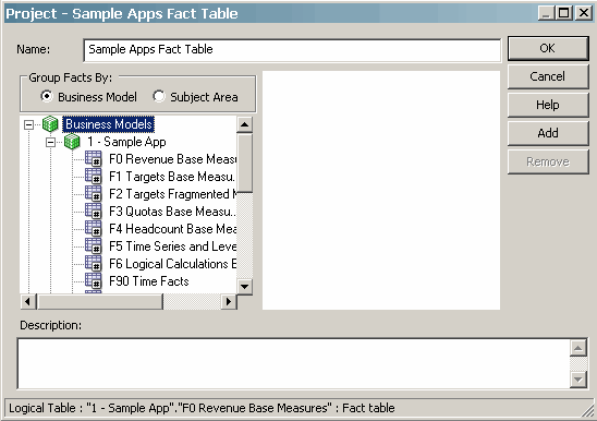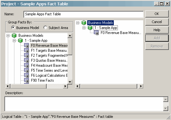 | 7 . | Select F0 Revenue Base Measures in the left pane and click Add. The logical fact table appears in the right pane.![]() |