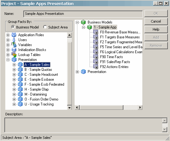 | 15 . | Select A - Sample Sales in the left pane and then click Add. Presentation (A - Sample Sales) appears in the right pane.![]() |