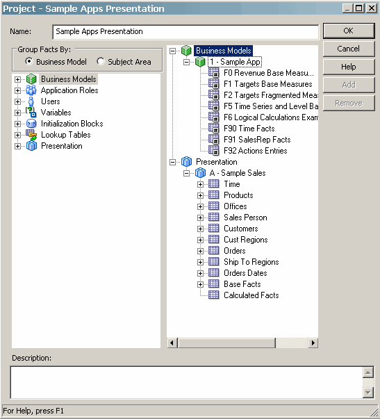 | 4 . | Click Action > New Project.![]() The Project dialog box appears. The Project dialog box is composed of two panes—the available objects are contained in the left pane, whereas the selected items are contained in the right. You build the project by adding subject areas or logical fact tables to the project. Additionally, the Project dialog box consists of a name text box (required entry) and a description text box (optional) for documentation purposes. ![]() You can group facts by subject area or by business model. You can also select one or more logical fact tables in the business model that are related to the subject area or you can select a subject area. The Add button is enabled once an object is selected in the left pane. The Administration Tool adds all the logical fact tables automatically. Adding a subject area includes all fact tables and dependencies in the subject area. Adding a logical fact table includes the subject area containing the table. In both cases, logical dimension tables joined to the logical fact tables are implicitly included, even though they do not appear in the right pane. |