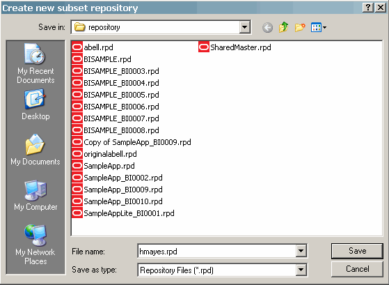 | 4 . | The "Create new subset repository" dialog box appears.![]() In the "Create new subset repository" dialog box, change the default file name, Metadatan.rpd (where n represents a variable number), to abell.rpd. There are several items to note at this point: