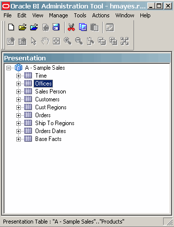 | 2 . | The SharedMaster repository opens. Expand A - Sample Sales to verify that the deleted objects (Customers and Cust Regions) do not appear. ![]() At this point, you can undo the local merge, discard the local changes, or publish the repository. These options are available from the File > Multiuser submenu. If other local repositories need to be merged (for example, hmayes.rpd), you must merge these before publishing. When working in a MUDE, the master repository is not locked when you merge local changes. Instead, the master repository is locked during the "Publish to Network" step. This reduces the total time that the master repository is locked to avoid lock contention issues. An Oracle best practice is to publish immediately following the merge. |