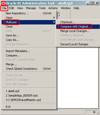 The Oracle BI Repository development process is conceptually identical to the classic Software Configuration Management (SCM) three-way merge, in that changes are managed by merge and reconciliation. The Oracle BI Repository is stored as an .rpd file. Changes are managed by using the Administration Tool. Developers check out the file and make changes locally. Then, these changes are reconciled and merged into the master repository. To read a more detailed description and view an image of the merge process, click this link.