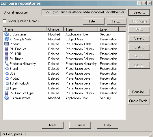 | 2 . | The "Compare repositories" dialog box appears. In this example, this dialog box compares abell.rpd (the subset repository) with originalabell.rpd. You can see the deletion of the Presentation layer tables by Adam. Scroll down and examine all objects that were deleted.![]() Within this dialog box, you can perform functions, such as Equalize (used to treat two objects in two repositories that have the same name but different upgrade IDs as the same object), Mark (annotates the object you select with a surrounding box for comparison against other objects), Create Patch (generates an XML patch file that contains only the changes made to a repository, which can then be applied to the original version of the repository to create the new version), and so on. |