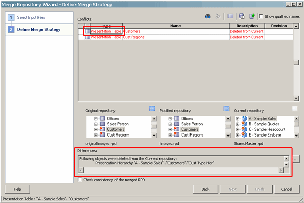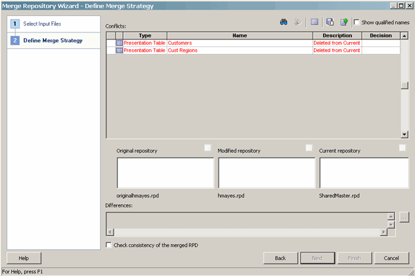 - If there are any conflicts, the Merge Repository Wizard opens and displays the Define Merge Strategy page. You then make merge decisions about whether to include or exclude objects by choosing Current or Modified from the Decision drop-down list.