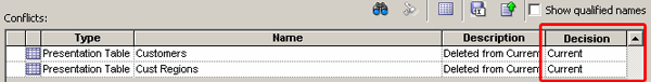 | 7 . | In the Conflicts table at the top of the wizard, select the Decision drop-down list for the Cust Regions table, and then select Current.![]() |